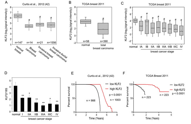 Figure 1: KLF2 is downregulated in human breast tumors and correlated with patients survival. A. Levels of KLF2 in samples from normal breast, breast carcinoma, invasive breast carcinoma and invasive ductal breast carcinoma reported in [42]. B., C. Levels of KLF2 in normal breast tissue and all breast tumors B. or tumors at different stages of breast cancer C. deposited in The Cancer Genome Atlas (https://tcga-data.nci.nih.gov/tcga/). Group sizes for normal, IA, IB, IIA, IIB, IIIA, IIIB, IIIC and IV were 58, 42, 7, 151, 92, 54, 15, 17, and 12, respectively. Data in A.-C. were obtained from OncomineTM (Compedia Bioscience, Ann Arbor, Michigan). Whisker indicates S.D., + indicates mean. **p < 0.01, #p < 0.0006. D. Levels of KLF2 in TissueScanTM tissue qPCR array consisting of cDNA derived from samples of normal breast and denoted stages of breast tumors (OriGene). Mean±SD. *p < 0.05, **p < 0.01 vs. normal tissue. E., F. Expression levels of KLF2 and their correlations with the survival rate of patients with breast cancer in two studies. Data were obtained from OncomineTM.