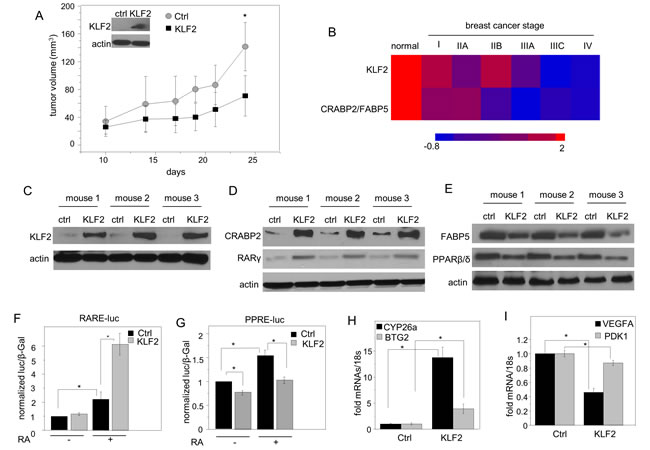 Figure 2: KLF2 is involved in regulating RA signaling. A. NCr athymic female mice were injected with 5x106 MDA-MB-231 cells into the right flank and cells stably expressing KLF2 into the left flank. Tumor growth at both injection sites was monitored by measuring the length and width with calipers and tumor volume calculated as (length x width2)/2. Data are mean±S.D. (n = 10) *p < 0.05 vs. control (ctrl) tumors by Paired Student’s T-test. Inset: Immunoblots demonstrating stable over-expression of KLF2. B. Changes in expression of KLF2 and in the CRABP2/FABP5 ratio during breast cancer progression. Data were obtained by analyzing TissueScanTM tissue qPCR array consisting of cDNA derived from samples of normal breast and denoted stages of breast tumors (OriGene). Expression of KLF2, CRABP2 and FABP5 mRNA was normalized to 18s. C. Immunoblots of KLF2 in tumors that arose from parental and KLF2-overexpressing cells. D. Immunoblots of CRABP2 and RARγ in tumors that arose from parental and KLF2-overexpressing cells. E. Immunoblots of FABP5 and PPARβ/δ in tumors that arose from parental and KLF2-overexpressing cells. F., G. MDA-MB-231 cells stably overexpressing GFP (Ctrl) or GFP-KLF2 (KLF2) were co-transfected with vector harboring a luciferase reporter driven by RAR response element (RARE-Luc) F. or PPAR response element (PPAR-Luc) G. and a vector encoding β-galactosidase, serving as a transfection control. Transactivation assays were carried out in the absence and presence of RA (50 nM for RARE; 200 nM for PPRE). Luciferase activity was normalized to β-galactosidase. Mean±S.D., n = 3. *p < 0.05, paired Student’s T-test. H. Levels of mRNA for BTG2 and CYP26a in tumors that arose from parental and KLF2-overexpressing cells were measured by Q-PCR. Mean±SD, n = 3. *p < 0.05, paired Student’s T-test. I. Levels of mRNA for VEGFA and PDK1 in tumors that arose from parental and KLF2-overexpressing cells were measured by Q-PCR. Mean±SD, n = 3. *p < 0.05, paired Student’s T-test.