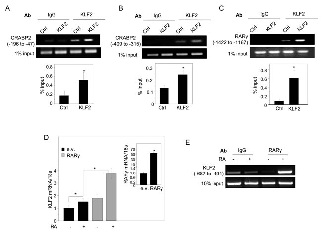 Interestingly, treatment with RA induced the expression of KLF2, and ectopic overexpression of RARγ enhanced the response (Figure 4D). ChiP assays showed that RA triggered recruitment of RARγ to a direct repeat 2 (DR-2) RARE present at 687 bp upstream from the KLF2 transcription start site (Figure 4E), indicating that RARγ directly controls KLF2 transcription. Hence, KLF2 and RARγ appear to form a positive feedback loop through which they promote each other’s expression.