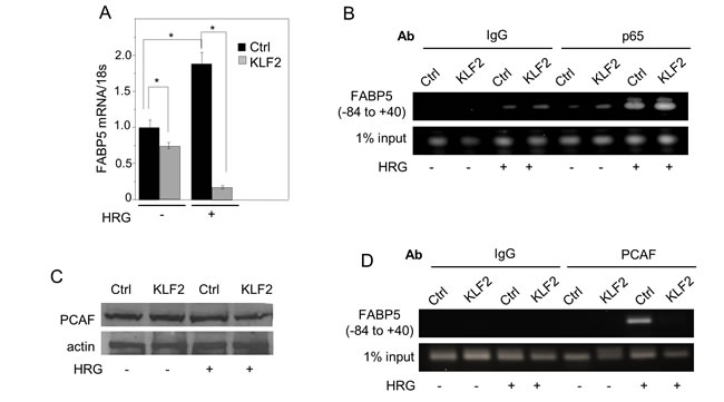 Figure 5: KLF2 suppresses FABP5 by interfering with the transcriptional activity of NFκB at the FABP5 promoter. A.. MDA-MB-231 cells stably over-expressing GFP or KLF2 were serum starved overnight, treated with vehicle or heregulin-β1 (HRG, 30 µg/ml) for 4 h. and level of FABP5 mRNA was measured by Q-PCR. Mean±SD (n = 3). *p < 0.05. B., D. ChIP assays were carried out using MDA-MB-231 cells stably over-expressing GFP or KLF2 untreated or treated with HRG with presence or absence of HRG (30 µg/mL, 24 h). Immunoprecipiations was carried out using non-specific IgG or antibodies against the NFκB subunit p65 B. or antibodies against PCAF D. Immunoprecipitated DNA was amplified using primers for the NFκB response element of the FABP5 promoter. C. Immunoblots demonstrating expression level of PCAF in MDA-MB-231 cells stably over-expressing GFP or KLF2 in the absence or presence of HRG (30 µg/ml, 24 h).