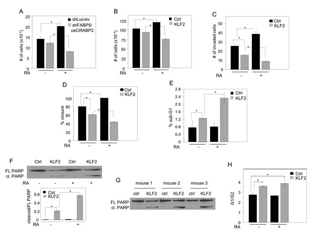 MDA-MB-231 cells express a high FABP5/CRABP2 ratio and, consequently, RA promotes their growth (Figure 6A). To decrease this ratio, FABP5 expression was downregulated using two different shRNAs and, concomitantly, CRABP2 was ectopically overexpressed (Figure S3A). In contrast with its effect on the growth of parental MDA-MB-231 cells, RA suppressed the growth of cells which express a low FABP5/CRABP2 ratio (Figure 6A, Figure S3B). In accordance with the notion that the tumor suppressing activity of KLF2 is exerted at least in part by controlling RA signaling, ectopic expression of this factor, similarly to direct alteration of the FABP/CRABP2 ratio, converted RA from a pro- to an anti-proliferative agent (Figure 6B, Figure S3C). In addition to promoting cell proliferation, RA enhanced cell invasion through a matrix gel (Figure 6C) and facilitated wound closure in scratch assays (Figure 6D, Figure S3D). Conversely, in KLF2-overexpressing cells, RA suppressed cell invasion and inhibited wound closure (Figure 6C, 6D, Figure S3D). KLF2 displayed a modest apoptotic activity on its own but it markedly potentiated RA-induced apoptosis (Figure 6E, 6F, Figure S3D). Similarly to the response of cultured cells, KLF2-overexpressing tumors that arose in NCr mice (Figure 2A) displayed a higher apoptotic status, reflected by PARP cleavage (Figure 6G). FACS analysis (Figure 6H, Figure S4 ) showed that, in parental cells, 57.6±11.6% and 59.9.8±10.1% were in G1 phase and 20.8±2.2% and 22.5±3.3% were in G2 phase in the absence and presence of RA, respectively. Interestingly, overexpression of KLF2 shifted the distribution resulting in 63.4±9.4% and 17.6±2.9% of cells placed in G1 and G2 phases, respectively. Similarly to parental cells, this distribution was not affected by RA treatment (Figure 6H). These observations thus show that KLF2 expression resulted in a G1 arrest even in the absence of RA and suggest that, in addition to regulating RA signaling, KLF2 also exerts additional RA-independent antiproliferative activities.