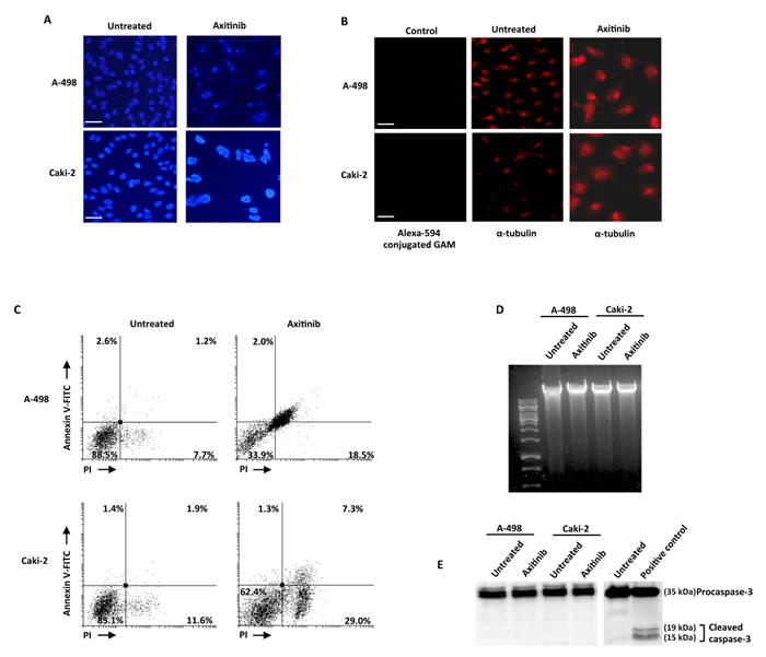 Figure 6: Axitinib induces mitotic catastrophe in RCC cells. A. Nuclei of RCC cells untreated or treated with axitinib for 96 h were stained with Hoechst 33258 and then analyzed on ten random fields. Cells were observed under a fluorescence microscope. Bar: 50 μM. B. Representative images of RCC cells treated as above described, and then immunostained with anti-α-tubulin antibody. Bar: 50 μM. C. RCC cells were cultured for 96 h with axitinib. Flow cytometric analysis was performed on treated cells by Annexin V-FITC and PI double-staining. Data represent the percentage of PI and/or Annexin V positive cells. D. Representative agarose gel electrophoresis of DNA extracts obtained from untreated or axitinib treated cells at 96 h for assessment of DNA fragmentation. E. Representative immunoblot of caspase-3 in RCC cells treated as above described.