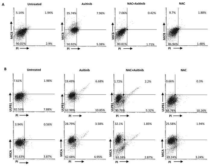 Figure 8: ROS-dependent axitinib-induced increase of NKG2D ligand expression in the RCC cell lines. A. Increase of MICB surface expression was analyzed by flow cytometry on A-498 RCC cell line treated with axitinib for 72 h with or without pretreatment with NAC 10 mM for 1 h. Representative dot plots illustrate the double fluorescence ligands-APC/PI. Numbers represent the percentage of cells in each quadrant. Data are representative of 1 of 4 independent experiments. B. Increase of MICA and ULBP1 surface expression was analyzed by flow cytometry on Caki-2 RCC cells treated with axitinib for 72 h with or without pretreatment with NAC 10 mM for 1 h. Representative dot plots illustrate the double fluorescence ligands-APC/PI. Numbers represent the percentage of cells in each quadrant. Data are representative of 1 of 4 independent experiments.