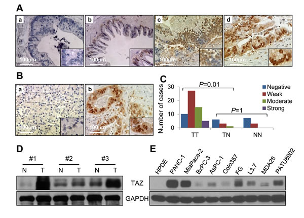 Figure 1: Expression of TAZ in pancreatic tumors and pancreatic cancer cell lines. Pancreatic tumor specimens in a TMA were immunostained for TAZ protein using a specific anti-TAZ antibody. A. Stains of pancreatic tumor specimens showing a. negative TAZ staining, b. weakly positive TAZ staining, c. moderately positive TAZ staining, and d. strongly positive TAZ staining. B. Stains of nonmalignant pancreatic tissue specimens showing negative TAZ staining a., while pancreatic cancer tissue showing positive TAZ staining b. C. Graph showing that the expression of TAZ was significantly higher in tumor (TT) than in tumor-adjacent normal tissue (TN) specimens and that TAZ expression did not differ significantly between TN and normal tissue (NN) specimens. D. Western blot verifying the expression of TAZ protein in paired normal pancreatic tissue (N) and pancreatic tumor (T) specimens. E. Western blot showing the expression of TAZ protein in pancreatic cancer cell lines.