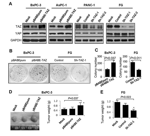 Figure 2: Effect of altered TAZ expression on pancreatic cancer cell growth in vitro and in vivo. A. Western blots showing altered expression of TAZ and YAP in pancreatic cancer cell lines with stable overexpression of TAZ (BxPC-3 and AsPC-1) or depletion of TAZ (FG and PANC-1). B. and C. A colony formation assay was performed using 24-well plates, and the resulting BxPC-3 and FG cell colonies were counted 14 days after the cells were seeded. (D and E) BxPC-3 cells with TAZ overexpression D. and FG cells with TAZ depletion E. were injected subcutaneously into the right scapular regions of nude mice (n = 5). The resulting tumors were removed from the mice and weighed. The data are presented as the mean ± standard error of the mean from three independent experiments. P values are provided, as comparisons were performed as indicated.