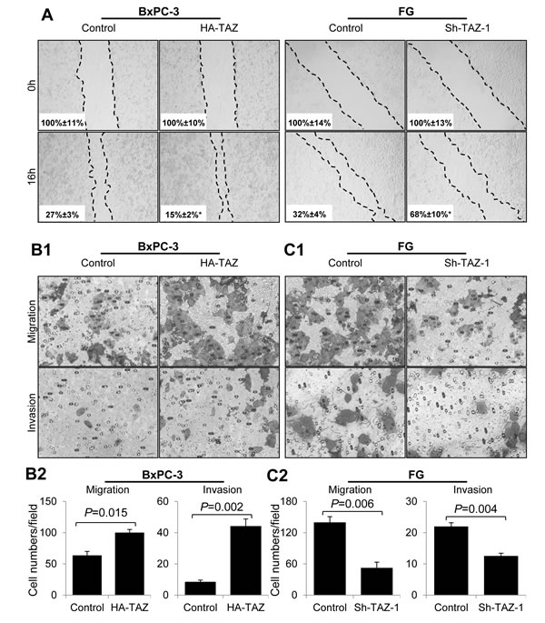 Figure 3: Effect of altered expression of TAZ on pancreatic cancer cell migration and invasion. BxPC-3 cells were transiently transfected with HA-TAZ or a control vector, and FG cells were transfected with Sh-TAZ-1 or a control vector. Cell scratch-wound, transwell migration, and invasion assays were used as described in Materials and Methods. Representative photos of wound healing, migration and invasion are shown. The data are presented as the mean ± standard error of the mean from three independent experiments. P values are provided, as comparisons were performed as indicated.