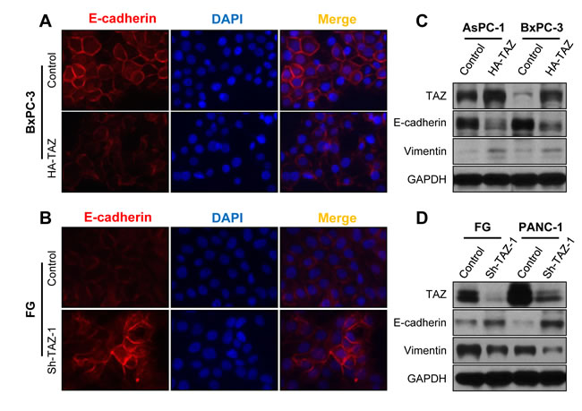 Figure 4: Influence of TAZ expression on the EMT phenotype of pancreatic cancer cells. AsPC-1 and BxPC-3 cells were transfected with HA-TAZ or a control vector, and FG and PANC-1 cells were transfected with Sh-TAZ-1 or a control vector. A. and B. Immunofluorescent stains showing E-cadherin expression in BxPC-3 and FG cells. DAPI, 4’,6-diamidino-2-phenylindole. C. and D. Western blots showing an abundance of the EMT markers E-cadherin and vimentin in pancreatic cancer cells.