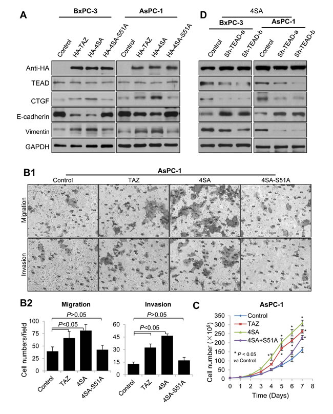 Figure 6: Mediation of the oncogenic function of TAZ in pancreatic cancer cells by TEAD transcription factors. A. BxPC-3 and AsPC-1 cells were transfected with HA-TAZ, HA-4SA, HA-4SA-S51A, or a control vector. The Western blots show the expression of TAZ and its mutants, TEADs, CTGF, E-cadherin, and vimentin in the cells. B. AsPC-1 cells were transfected with a control vector, HA-TAZ, HA-4SA, or HA-4SA-S51A, and transwell migration and invasion assays were used as described in Materials and Methods. Representative photographs of the cell migration and invasion are shown. C. Graph showing the AsPC-1 cell growth as assessed via cell counting at the indicated time points. The data are presented as the mean ± standard error of the mean from three independent experiments. D. HA-4SA was co-transfected into BxPC-3 and AsPC-1 cells with control vector or shRNAs of TEAD. The Western blots show the expression of TAZ mutants, TEADs, CTGF, E-cadherin and vimentin in the cells.