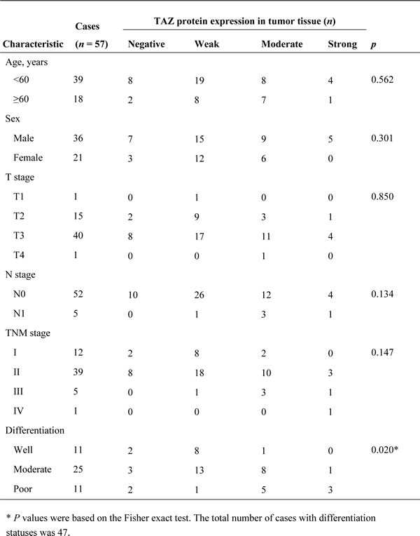 Table 1: TAZ expression in and clinicopathologic characteristics for the human pancreatic cancer TMA.