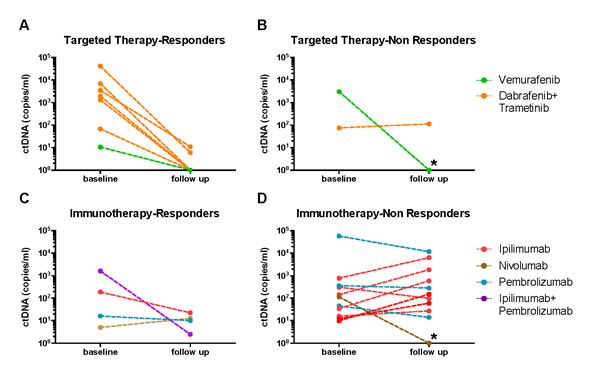 Figure 2: Change in ctDNA levels after therapy initiation relative to baseline. Plasma samples were tested for ctDNA at baseline and between 4 to 8 weeks after therapy initiation (follow up). Cases are colour coded according to therapy, and grouped by therapy type and response. * indicates two patients that were classified as non-responders but had stable disease for at least 6 months.