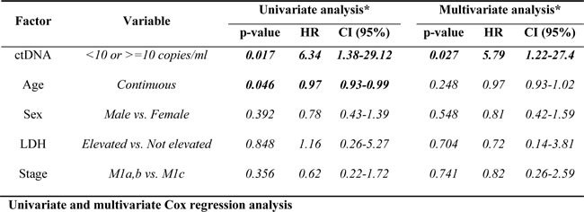 Univariate Cox proportional hazards regression analyses were performed to examine association of ctDNA levels, age, sex, metastatic disease stage and LDH status with PFS. Multivariate Cox regression models were evaluated using a stepwise approach with bidirectional elimination to determine the best fit model. Results were analysed in SPSS v22.0 and GraphPad Prism 5. Results were considered statistically significant at p < 0.05.