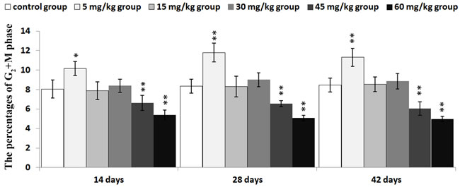 Figure 4: Changes of the percentages of G2+M phase in the thymus Data are the means ± standard deviation (n=5) *p<0.05, compared with the control group **p<0.01, compared with the control group.