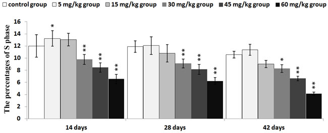Figure 5: Changes of the percentages of S phase in the thymus Data are the means ± standard deviation (n=5) *p<0.05, compared with the control group **p<0.01, compared with the control group.