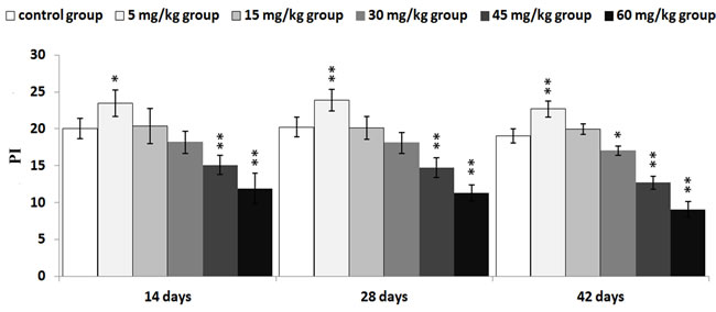 Figure 6: Changes of thymocyte PI (proliferating index) PI =(S+(G2+M))/((G0/G1)+S+(G2+M)) Data are the means ± standard deviation (n=5) *p<0.05, compared with the control group **p<0.01, compared with the control group.