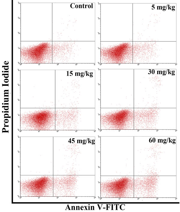 TUNEL assay TUNEL assay showed apoptotic thymocytes with brown-stained nuclei. There were increased frequencies of apoptotic thymocytes in the 30 mg/kg, 45 mg/kg and 60 mg/kg groups when compared with those in the control group, as shown in Figure 9.
