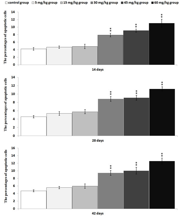 Figure 8: Changes of the percentages of apoptotic cells in the thymus by flow cytometry Data are the means ± standard deviation (n=5) *p<0.05, compared with the control group **p<0.01, compared with the control group.