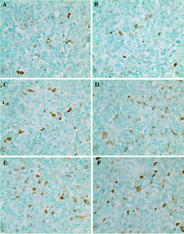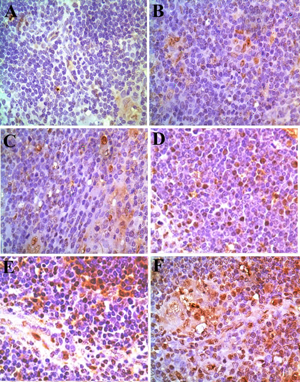Figure 12: Changes of Bcl-2 protein expression in the thymus at 42 days of age There is abundant Bcl-2 protein expression (brown-stained) in control group (A). The Bcl-2 protein expression is obviously decreased in the 30 mg/kg group (D), 45 mg/kg group (E) and 60 mg/kg group (F) at 42 days of age. Immunohistochemistry ×1000.
