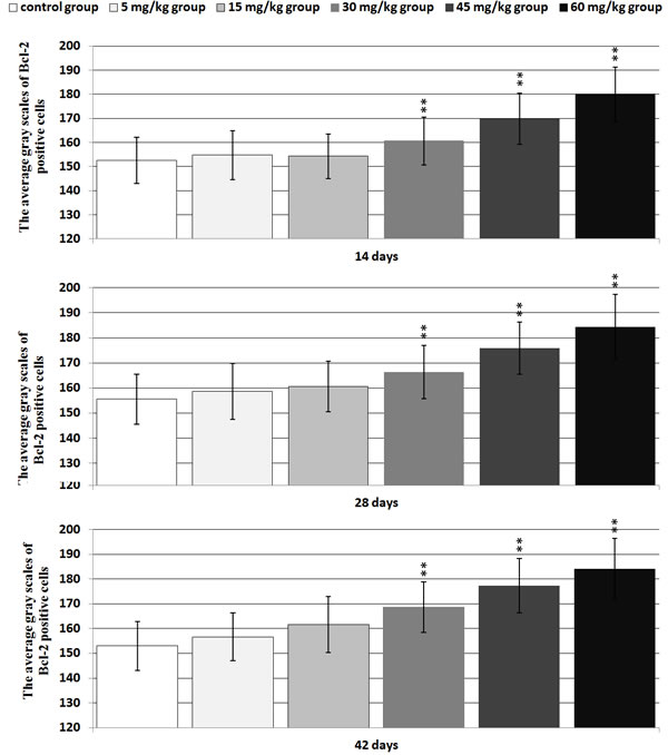 Figure 13: The average gray scales of positive cells containing Bcl-2 protein expression in the thymus. Immunoreactive intensity was expressed by average grayscale. Values < 160 were considered high expression, 160-170 medium expression and 170-180 low expression. Data are the means ± standard deviation (n=5×5) *p<0.05, compared with the control group **p<0.01, compared with the control group.