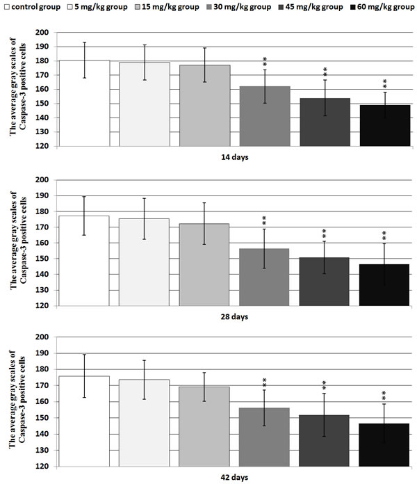 Figure 15: The average gray scales of positive cells containing caspase-3 protein expression in the thymus. Immunoreactive intensity was expressed by average grayscale. Values < 160 were considered high expression, 160-170 medium expression and 170-180 low expression. Data are the means ± standard deviation (n=5×5) *p<0.05, compared with the control group **p<0.01, compared with the control group.