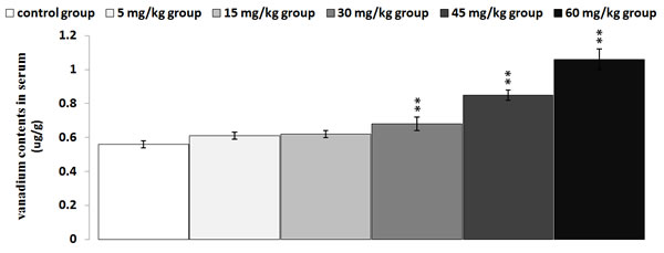 Figure 17: Changes of vanadium contents in the serum at 42 days Data are the means ± standard deviation (n=5) *p<0.05, compared with the control group **p<0.01, compared with the control group.