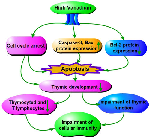 Figure 18: The toxic effect mechanism of vanadium on thymic development Vanadium promotes cell-cycle arrest and caspase-3 and Bax protein expression, and inhibits Bcl-2 protein expression. Cell-cycle arrest, Bax and caspase-3 protein expression up-regulation, and Bcl-2 protein expression down-regulation cause apoptosis. Cell-cycle arrest, apoptosis inhibit thymic development, which finally results in impairment of cellular immunity.