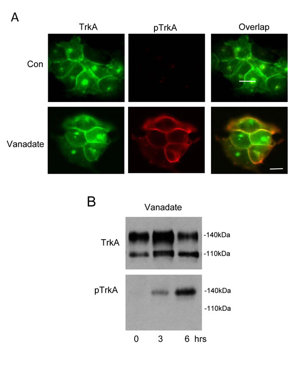 Figure 1: Cell surface but not GN-associated TrkA is activated by Sodium Orthovanadate. A. Indirect IF demonstrating overlap (yellow, bottom right panel) in surface and GN-associated TrkA (green, top and bottom left panels) and phosphorylated TrkA (pTrkA: red, top and bottom middle panels) in untreated (Con) and sodium orthovanadate-treated (Vanadate; 0.1mM for 3 hours) TrkA SH-SY5Y cells (bars = 10µm). B. Western blot demonstrating the effect of sodium orthovanadate (vanadate; 0.1mM for 3 and 6 hours) on total (TrkA) and tyrosine phosphorylated TrkA (pTrkA) levels.