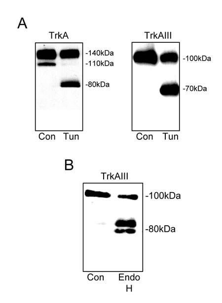 Figure 2: 100kDa TrkAIII is an immature N-glycosylated receptor. Western blots demonstrating the effect of tunicamycin (Tun, 0.1mM for 16 hours) on the molecular size of A) TrkA and TrkAIII, in total TrkA SH-SY5Y and TrkAIII SH-SY5Y cell extracts (30µg). B) Western blot demonstrating degradation of immunoprecipitated 100kDa TrkAIII (Con) by Endoglycosidase H (Endo H).