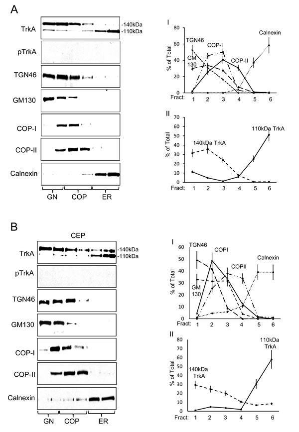 The steady state intracellular distribution of TrkA and TrkAIII was compared in density-gradient ultracentrifugation purified membrane fraction prepared under untreated (control) and CEP-701-treated (100nM for 16 hours) conditions (Figure 3). In TrkA SH-SY5Y cells, 76.6+6.9% of immature 110kDa TrkA was ER-associated (calnexin positive fractions 5 and 6), 7.2+0.9% COP-associated (COPI/II positive fractions 3 and 4) and 16.2+1.5% GN-associated (TG46/GM130 positive fractions 1 and 2) (Figure 3A I-II), whereas 1.2+0.1% of mature 140kDa TrkA was ER-associated (fractions 5 and 6), 34.9+2.4% COP-associated (fractions 3 and 4) and 63.8+3.8% GN-associated (fractions 1 and 2) (Figure 3A I-II), confirming GN-associated 140kDa TrkA maturation. CEP-701 (100nM) did not significantly alter the steady state distribution of either 110kDa or 140kDa TrkA (Figure 3B I-II). TrkA tyrosine phosphorylation was not detected (Figure 3A).