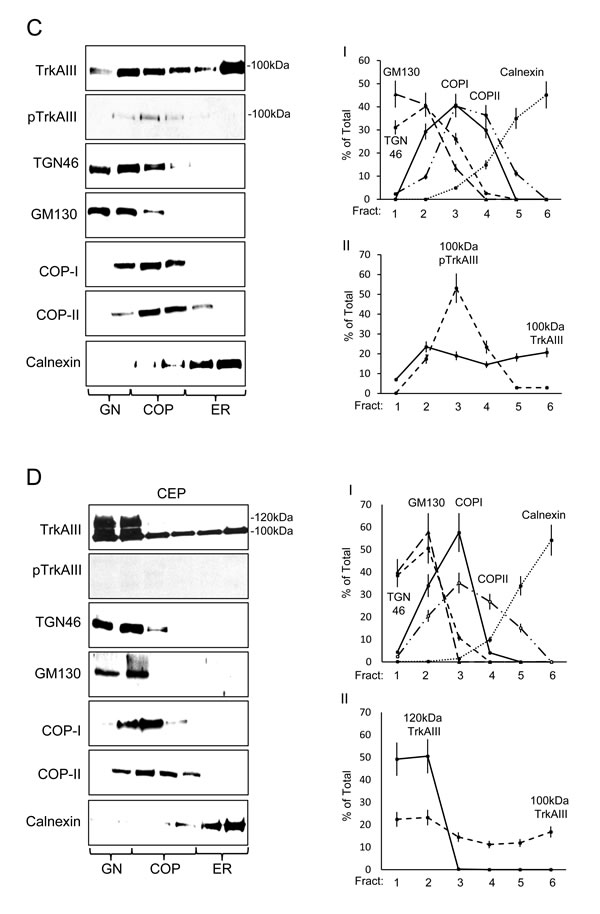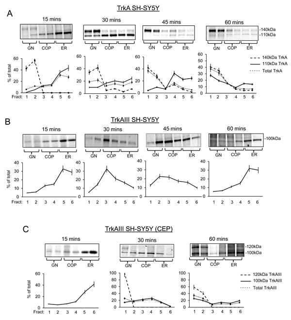 Figure 4: TrkAIII but not TrkA returns to the ER. Representative autoradiographs plus line graphs demonstrating time-dependent changes in the distribution of pulse labelled 110kDa/140kDa TrkA and 100kDa/120kDa TrkAIII in density-gradient ultra-centrifugation purified GN, COP vesicle and ER membrane fractions from: A. untreated TrkA SH-SY5Y cells; B. untreated TrkAIII SH-SY5Y cells; and C. TrkAIII SH-SY5Y cells treated with 100nM CEP-701 (CEP), at the times indicated in minutes, following metabolic pulse labelling (presented as the mean ± s.d. percentage of total, derived from densitometric analysis of autoradiographs from independent experiments, performed in duplicate).