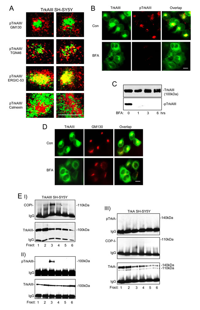 Figure 5: Spontaneous TrkAIII activation occurs within the ERGIC/COPI compartment. Representative confocal IF micrographs demonstrating different degrees of association (yellow) between Y490-phosphorylated TrkAIII (pTrkAIII) (red) and GM130 (green) (top panels); pTrkAIII (red) and TGN46 (green) (2nd panels); pTrkAIII (red) and ERGIC-53 (green) (3rd panels); and pTrkAIII (red) and Calnexin (green) (bottom panels) in individual representative TrkAIII SH-SY5Y cells (magnification x100; bar = 10µm). B. Indirect non-confocal IF, demonstrating the degree of overlap (yellow) between TrkAIII (green) and phosphorylated TrkAIII (red) in untreated TrkAIII SH-SY5Y cells (Con) (top 3 panels) and BFA-treated (0.1µM for 3 hr) TrkAIII SH-SY5Y cells (bottom 3 panels; bar = 10µm). C. Western blots of whole cell extracts (30µg), demonstrating the effect of BFA (0.1µM for 0, 1, 3 and 6 hours) on total and tyrosine phosphorylated TrkAIII. D. Indirect non-confocal IF, demonstrating overlap (yellow) and general distribution of TrkAIII (green) and GM130 (red) in untreated (Con) and BFA-treated (0.1µM for 3 hr) TrkAIII SH-SY5Y cells. Western blots demonstrating: EI. TrkAIII co-immunoprecipitation of COP-I in density gradient ultracentrifugation-purified TrkAIII SH-SY5Y membranes; EII. The presence of tyrosine phosphorylated TrkAIII in TrkAIII immunoprecipitates from the same TrkAIII SH-SY5Y membrane preparation and EIII. The absence of TrkA/COPI co-immunoprecipitation and TrkA tyrosine phosphorylated in density gradient ultracentrifugation-purified intracellular membranes from TrkA SH-SY5Y cells.