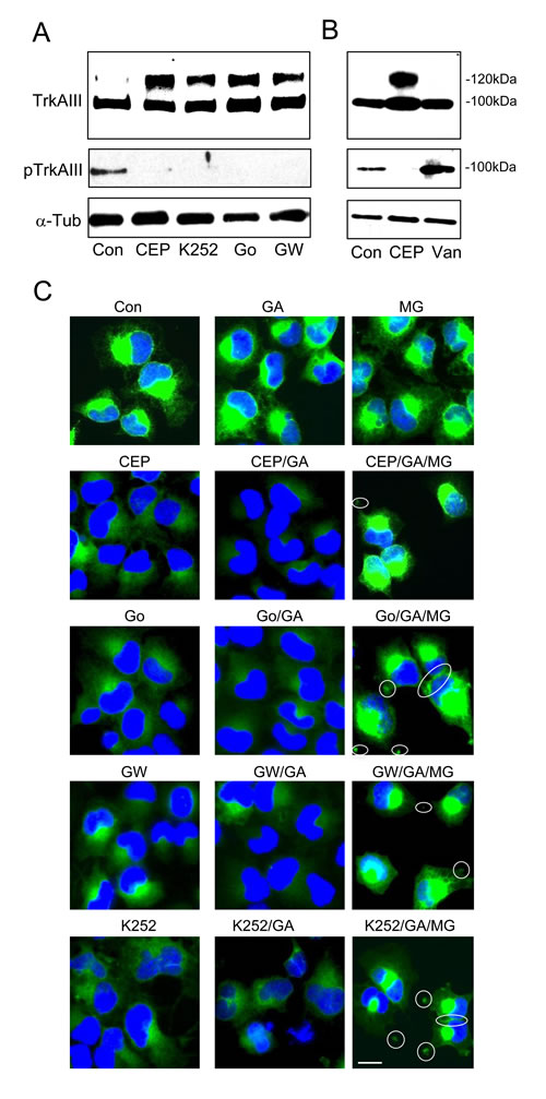 Figure 6: TrkA inhibitors promote 120kDa TrkAIII maturation and degradation. A. Western blots demonstrating the levels of 100kDa and 120kDa TrkAIII (TrkAIII), tyrosine phosphorylated TrkAIII (pTrkAIII) and α-tubulin in total extracts (30µg) from untreated (con); CEP-701-treated (CEP; 100nM for 6 hours); K252a-treated (K252; 100nM for 6 hours); Go6076-treated (Go; 100nM for 6 hours) and GW441756-treated (GW; 100nM for 6 hours) TrkAIII SH-SY5Y cells. B. Western blots comparing the effects of CEP-701 (CEP) and sodium orthovanadate (Van) on 100kDa and 120kDa TrkAIII levels and TrkAIII tyrosine phosphorylation (pTrkAIII). C. Indirect IF demonstrating changes in TrkAIII IF intensity and distribution in TrkAIII SH-SY5Y cells treated with CEP-701 (CEP), Go6976 (Go), GW441756 (GW) and K252a (K252), alone or in combination with GA plus or minus MG-132 (MG). Potential sites of cell surface TrkAIII are circled (bar = 10µm).