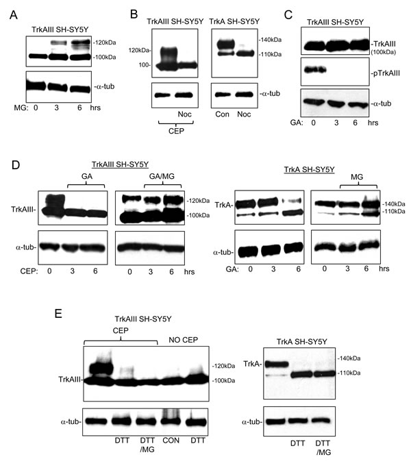 Figure 7: 120kDa TrkAIII is degraded at the proteasome, is microtubule-dependent and GA-sensitive. Western blots demonstrating: A. the effect of MG-132 (1µM for 3 and 6 hours) on 100kDa TrkAIII, 120kDa TrkAIII and α-tubulin (α-tub) levels in TrkAIII SH-SY5Y cells; B. the effect of Nocodozol (Noc; 100µM for 6 hours) upon 100kDa TrkAIII, 120kDa TrkAIII and α-tubulin (α-tub) levels in CEP-701-treated (CEP) TrkAIII SH-SY5Y cells (left panel) and upon 110kDa TrkA, 140kDa TrkA and α-tubulin levels in TrkA SH-SY5Y cells (right panel); C. The effect of Geldanamycin (GA; 1µM for 3 and 6 hours) on 100kDa TrkAIII, 120kDa TrkAIII, tyrosine phosphorylated TrkAIII (pTrkAIII) and α-tubulin levels in TrkAIII SH-SY5Y cells; D. The effect of Geldanamycin (GA; 1µM for 3 and 6 hours) plus or minus MG-132 (MG; 1µM for 3 and 6 hours) on 100kDa TrkAIII, 120kDa TrkAIII and α-tubulin (α-tub) levels in TrkAIII SH-SY5Y cells pre-treated with CEP-701 (CEP; 100nM for 6 hours) to induced 120kDa TrkAIII expression (Left 4 panels), plus the effect of the same combinations of GA plus or minus MG132, in non-CEP-701 treated TrkA SH-SY5Y cells (right 4 panels); E. The effect of DTT (100µM for 6 hours) plus or minus MG-132 (MG; 1µM) on 100kDa TrkAIII, 120kDa TrkAIII and α-tubulin levels in CEP-701 pre-treated (CEP; 100nM for 6 hours) and non-CEP-701 treated TrkAIII SH-SY5Y cells (Left panels) and in untreated TrkA SH-SY5Y cells (right panels).