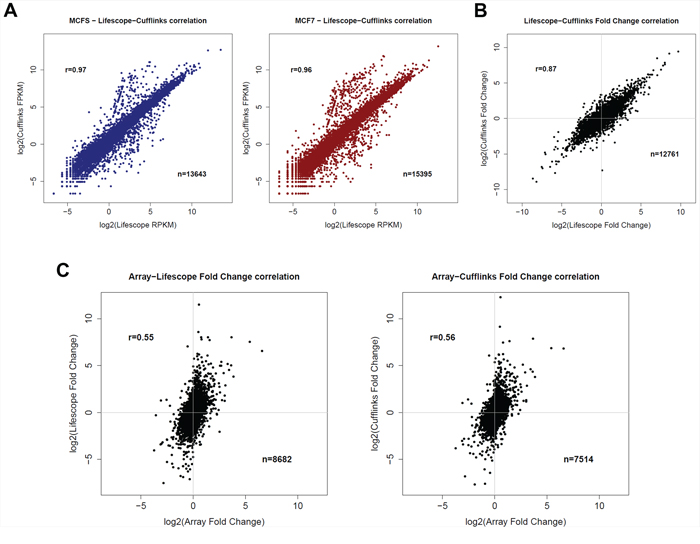 Figure 1: Comparison of different transcriptomic data. A. Correlation of RNA-seq gene quantification from MCFS (left) or MCF7 (right) cells obtained with the two pipelines used (Lifescope or Cufflinks). B. Correlation of log fold-changes between MCFS and MCF7 cells obtained with the two pipelines used (Lifescope or Cufflinks). C. Correlation of log fold-changes obtained using Arrays or RNA-seq transcriptomic data, processed with the Lifescope pipeline (left) or Cufflinks pipeline (right).