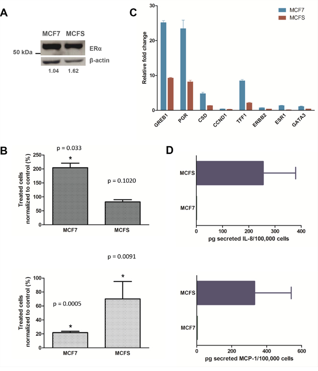 Figure 2: MCFS cell are less sensitive to E2 and fulvestrant stimulation and secrete higher quantities of IL-8 and MCP-1 compared to than MCF7 cells. A. Western blotting analysis for ERα expression. ERα protein levels were normalized to a loading control. Numbers reported below gel images were obtained by densitometric analysis and represent the relative expression level of ERα normalized to β-actin expression level. B. Effect of 17β-estradiol (top) and fulvestrant (bottom) on cell growth. Cells were exposed to 10−8 M 17β-estradiol or fulvestrant for 6 days, and their growth was evaluated by direct cell counting. Cell growth of treated cells was expressed as percentage of that of untreated cells. Bar charts represent a mean ± CV% of 3 experimental replicates (*P < 0.05 by two-tailed Student’s t test). C. Relative expression of ER-related genes in response to 17β-estradiol exposure. The relative expression levels of ER-related genes were measured after 48 h of exposure to 10−8 M 17β-estradiol by quantitative real-time PCR analysis and normalized to RPL13A expression level. Relative fold changes calculated by the ΔΔCt method refer to control cells. Bars represent mean ± SD relative fold changes, derived from 3 technical replicates. D. Quantification of secreted IL-8 (top) and MCP-1 (bottom) in conditioned media. The absolute quantity of cytokines secreted in culture media was measured by ELISA kit assays and normalized to the number of viable cells. Bars represent mean ± SD of cytokine levels (picograms per 105 cells) derived from 3 technical replicates.