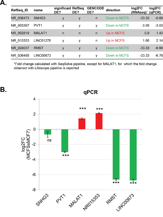 Figure 3: Selection and validation of differentially expressed non-coding RNAs. A. Table listing the 6 ncRNAs selected for experimental validation. B. Differential expression of candidate ncRNAs by semi-quantitative real-time RT-PCR. Bars represent mean ± SD of 3 technical replicates. Fold change between MCFS and MCF7 cells were calculated with the ΔΔCt method, setting the MCF7 sample as 1. The glucuronidase (GUSB) housekeeping gene was used as internal control for normalization. The results were analyzed by unpaired t-test: ***P < 0.0001; ns, not significant.