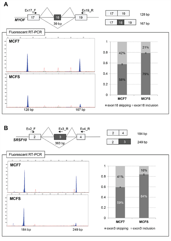 Figure 4: Validation of differentially expressed alternative splicing at the MYOF (A) and SRSF10 (B) loci by fluorescent RT-PCR. A. Schematic representation of the MYOF gene in the region comprised between exons 17 and 19 (top left) and of the two products obtained by fluorescent competitive RT-PCR (top right). Exons are shown by gray boxes, whereas introns are represented by lines (not to scale). Alternative splicing events are shown by broken lines. Primers used for RT-PCRs are indicated by arrows. The length of the fragments is also indicated. GeneMapper windows displaying fluorescence peaks (shaded in gray) corresponding to the different transcripts amplified by fluorescent RT-PCR on RNA from MCF7 cells and MCFS (bottom). The X-axis represents data points and the Y-axis represents fluorescence units. On the right, histograms representing the relative amount of transcripts including or skipping exon 18, as assessed by calculating the ratio of the corresponding fluorescence peak areas (setting the sum of all peaks as 100%). Bars represent mean ± SD of 3 independent experiments. B. Schematic representation of the SRSF10 gene in the region comprised between exons 3 and 4 (top left) and of the two products obtained by fluorescent competitive RT-PCR (top right). GeneMapper windows displaying fluorescence peaks (shaded in gray) corresponding to the different transcripts amplified on RNA from MCF7 cells and MCFS cells (bottom). On the right, histograms representing the relative amount of transcripts including or skipping exon 3, calculated as described above. Bars represent mean ± SD of 3 independent experiments.