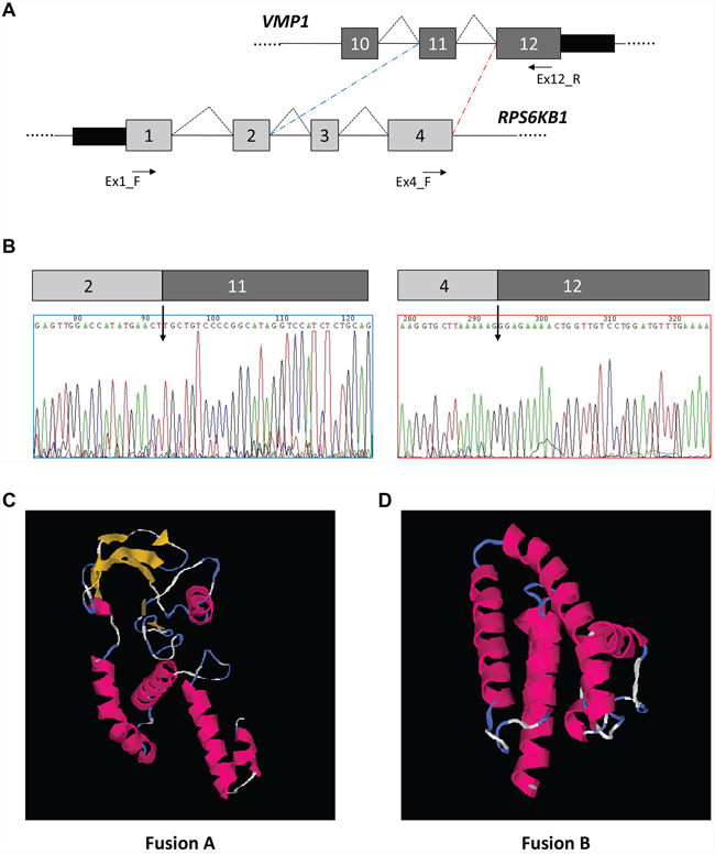 Figure 5: Identification of RPS6KB1-VMP1 gene fusion. A. Schematic representation of the VMP1 and RPS6KB1 genes in the region comprised between exons 1 and 4 (RPS6KB1) or exons 11 and 12 (VMP1). Coding exons are shown by gray boxes, whereas introns are represented by lines (not to scale). Splicing events are shown by broken lines, whereas fusions are indicated by dashed lines. Primers used for RT-PCRs are indicated by arrows. B. Electropherograms showing the nucleotide sequences around the identified fusion junctions. C. Molecular model of fusion A (RPS6KB1 exons 1 to 4 fused to VMP1 exon 12). D. Molecular model of fusion B (RPS6KB1 exons 1 and 2 fused to VMP1 exon 11)
