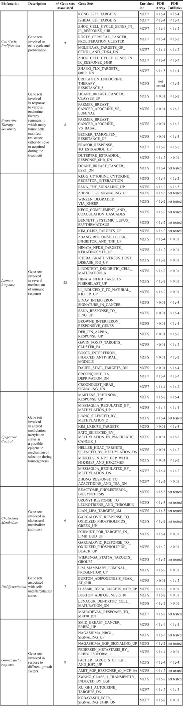 To obtain a meaningful interpretation of the findings, our approach was to distribute the gene sets in different categories, linking them to a possible biological function. Such biofunctions, which were differentially modulated in MCFS compared with MCF7 cells are listed in Table 1, together with information of the single gene sets supporting them. The main biofunctions are reported below, together with results of validation experiments.