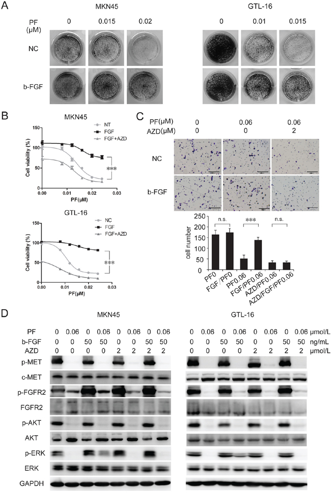 Figure 2: B-FGF-induced FGFR2 activation promoted PF unresponsiveness in MET-addicted GC cell lines. A. b-FGF induced PF resistance in MET-amplified cancer cell lines. Colony formation assays showed that stimulation of b-FGF resulted in obvious increase in PF-resistant cell clones. B. Combination of AZD4547 and PF significantly increased growth inhibition of MET-amplified cancer cells. MKN-45 and GTL-16 cells were exposed to PF (0–0.024 μM) or a combination of PF and b-FGF (50 ng/mL) or a combination of PF/b-FGF and AZD4547 (5 μM). Cell viability was measured using the CCK-8 cell-proliferation assay after 3 days of drug exposure. Values are the mean ± SD of 3 replicates. C. Activation of FGFR2 signaling pathway attenuated PF-induced suppression of cell motility. Transwell migration assays of GTL-16 cells were performed with the treatment of PF (0.01 μM), b-FGF 50 (ng/ml) and AZD4547 (2 μM) for 48 hours. The results are representative images of migration assays, Bars, 50 μm (top), and quantification of cells (bottom). Values are the mean ± SD of 3 assays; ***, P < 0.001, n.s., no statistical significance. D. b-FGF conferred PF resistance by restoring ERK activation. Cells were pretreated with TKIs for 6 hours, and then stimulated with b-FGF for 30 minutes before whole cell lysates were collected. Western blot showed that ERK, but not AKT, reactivated after adding b-FGF to the treatment of PF.