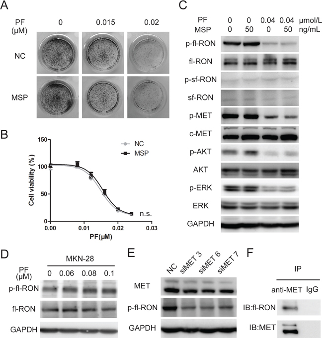 RON and MET belong to the same subfamily. It is clear that RON actively crosstalks with MET, and takes part in the regulation of tumorigenic activity [18]. Our previous data showed that knockdown of RON sensitized GC cells to PF. Unexpectedly, treating with MSP, the ligand of fl-RON, resulted in no increase of PF-resistant MKN-45 cell clones (Figure 3A). Cell viability assay in GTL-16 cells showed that MSP did not affect PF-induced inhibition of cell growth, neither (Figure 3B). Then we detected the phosphorylation status of RON and downstream signaling molecules with the treatment of PF and MSP. The western blot assay revealed that PF at 0.04 μM not merely blocked activation of MET, but also resulted in decreased fl-RON phosphorylation (Figure 3C). It is intriguing that PF, regarded as a highly selective inhibitor to MET, could cause decreased fl-RON phosphorylation. We performed a series of experiment to investigate that whether PF targets fl-RON directly or PF cause decreased fl-RON phosphorylation indirectly through other mechanisms. As shown in Figure 3, PF (0–0.1 μM) treatment in MKN-28 cells, a cell line with weak MET expression (Supplementary Figure S1), showed no inhibition to phosphorylation of fl-RON (Figure 3D). However, silencing MET via siRNA resulted in decreased fl-RON phosphorylation in MKN-45 cells (Figure 3E). This suggested the inhibition of PF to fl-RON may be depending on the status of MET. Co-immunoprecipitation analysis indicated that RON and MET could form heterodimers in GC cells, suggesting a transactivation of RON by MET (Figure 3F). MSP was unable to reactivate full-length RON and its downstream signaling when they were suppressed by PF (Figure 3C). Taken these data together, we concluded that in MET-addicted GC cells, fl-RON phosphorylation was inhibited by PF indirectly, probably through the inhibition of transactivation of RON and MET. And stimulation with MSP could not rescue the inhibition cause by PF.