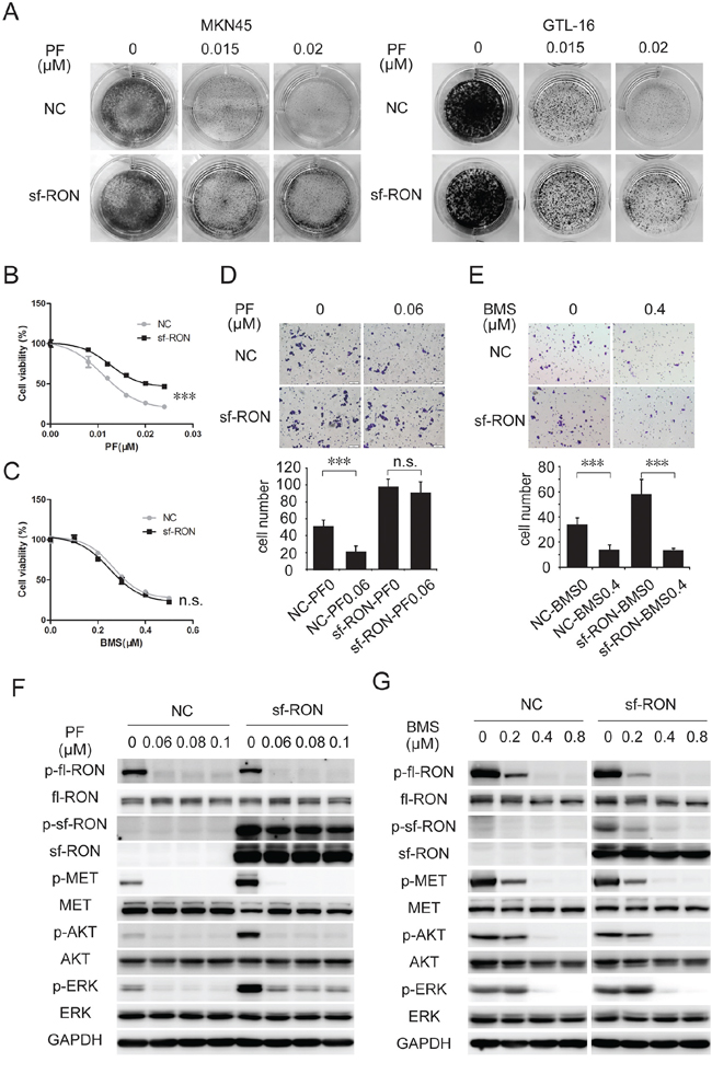 Figure 4: Upregulation of sf-RON attenuated PF-induced inhibition of cell proliferation and motility. A. and B. sf-RON induced PF resistance in MET-amplified GC cell lines. A, Colony formation assays showed that PF-resistant cell clones in the sf-RON group were greater than those in the NC group. B, cells were treated with increasing doses of PF (0–0.024 μM), followed by CCK-8 cell-proliferation assay at 72 hours. C. MET/RON dual inhibition suppressed viability of cells with sf-RON overexpression effectively. Cells were treated with BMS (0–0.5 μM), followed by CCK-8 cell-proliferation assay at 72 hours. D. and E. BMS, but not PF, abrogates sf-RON-induced extra cell motility. Transwell migration assays of GTL-16 cells were performed with the treatment of 0.06 μM PF (D) or 0.4 μM BMS (E) for 48 hours. Representative images of migration assays and statistics in bar graphs as indicated. Bars, 50 μm. Values are the mean ± SD of 3 assays; ***, P < 0.001, n.s., no statistical significance. F. sf-RON confers PF resistance by restoring ERK activation. G. BMS total blocked phosphorylation of MET/RON and downstream signaling. Cells in the NC group and sf-RON group were pretreated with PF (F) or BMS (G) for 6 hours before whole cell lysates were collected. Western blot analysis was conducted to examine the status of p-RON, p-MET, p-AKT, and p-ERK.