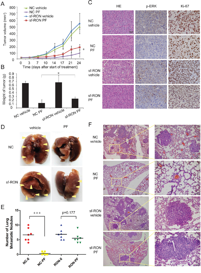 Figure 5: Upregulation of sf-RON contributed to PF resistance in vivo. A. Xenograft tumors on male nude mice were established with sf-RON-overexpressed GTL-16 cells and NC GTL-16 cells. Mice were treated for 7 days/week with either vehicle control (normal saline) or 4 mg/kg PF by oral gavage started at 7days after implantation (day 0). Tumor size was measured twice per week. Values are mean ± SD (n = 6/group); *, P < 0.05, NC PF group versus sf-RON PF group. B. 24 days after the start of treatment, the mice were euthanized. The weight of the tumors in each group was measured. Values are mean ± SD (n = 6/group); *, P < 0.05, NC PF group versus sf-RON PF group. C. Tumor tissue from xenografts treated for 24 days with the indicated drug regimens was evaluated by immunohistochemical staining for p-ERK and Ki67. Representative images as indicated; Original magnification, ×400, Scale bar, 50 μm. D, E, F. PF significantly reduced pulmonary metastatic nodules in NC PF group, but not in sf-RON PF group. D, Representative lungs from each group as indicated. E, The number of pulmonary metastatic nodules in each group was calculated. Values are mean ± SD (n = 6/group); ***, P < 0.001, NC PF group versus NC vehicle group. F, Representative results of histological examination of mouse lungs for metastatic nodules in 4 groups. Left panel, Original magnification, ×100, Scale bar, 200 μm; right panel, Original magnification, ×400, Scale bar, 50 μm.
