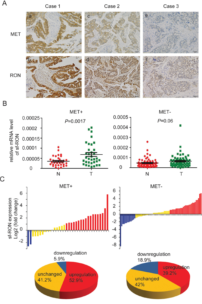 Figure 6: Expression of sf-RON was up-regulated in GC. A. co-expression of RON and MET in human GC. Representative images showed RON and MET co-expressed in human GC samples. (a) and (b) indicated strong positive expression of MET and RON in the same GC tissue; (c) and (d) indicated positive expression; (e) and (f) indicated negative expression. Original magnification, ×200. Scale bar, 50 μm. B. Upregulation of sf-RON correlated with MET status of GC. The expression levels of sf-RON in 103 paired GC and matched non-tumor tissues were determined by q-PCR. The relative mRNA level of sf-RON in GC was compared with that in paired non-tumor tissues. Statistical analysis of differences between the two groups was performed by paired Student’s t-test and P < 0.05 was considered statistically significant. C. sf-RON was up regulated in most MET-positive GCs. The data are expressed as the log2 fold change (ΔCt [GC/Non]). Significant upregulation of sf-RON expression in paired tumor/non-tumor samples was defined as a log2 fold change >1. The pie chart displayed the proportions of GC samples showing upregulation (red), downregulation (blue), and unchanged (yellow).