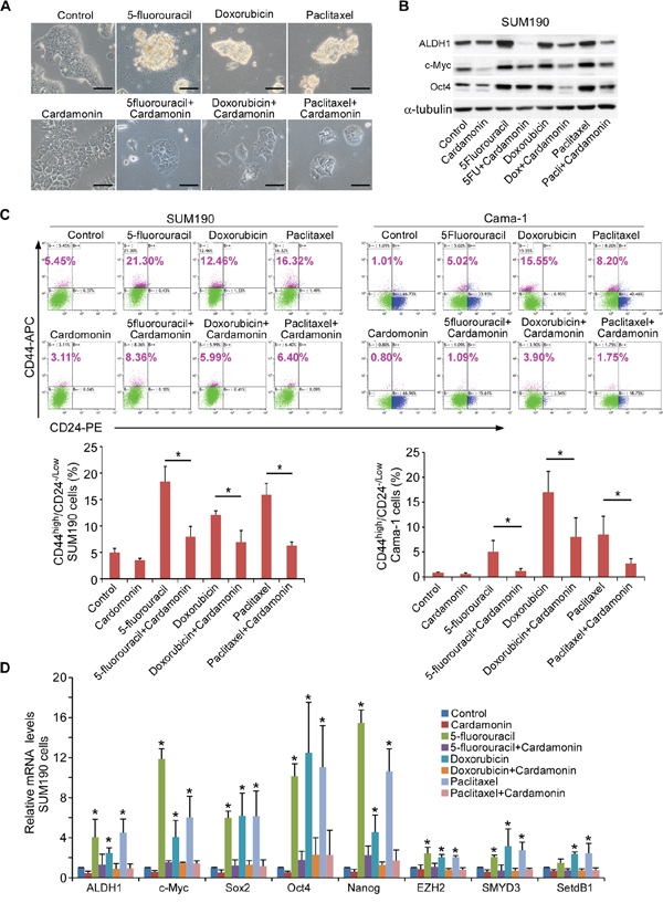 Figure 3: Co-treatment with cardamonin prevents the enrichment of CSCs induced by chemotherapeutic drugs. A. Cardamonin abrogates the formation of spherical clusters induced by chemotherapeutic drugs. Representative images of SUM190 cells after treatment with 5-fluorouracil (0.15 mM), Doxorubicin (0.6 μM), or paclitaxel (15 nM) in the presence or absence of cardamonin (7.5 μM) for 4d. Scale bars = 100 μm. B. Western blot analysis of ALDH1, c-MYC, and SOX2 proteins for the indicated groups as shown in A. α-tubulin was used as an internal loading control. C. Flow cytometry analysis of CD44high/CD24−/low subpopulation in SUM190 and Cama-1 cells after treatment with 5-fluorouracil (0.15 mM for SUM190, 0.25 mM for Cama-1), doxorubicin (0.6 μM), or paclitaxel (15 nM) in the presence or absence of cardamonin (7.5 μM) for 4d. Data represent means ± SD, n = 3; *p < 0.05. D. Q-PCR analysis of expression from stem cell-associated genes (ALDH1, c-MYC, SOX2, OCT4 and NANOG) and stem cell-associated chromatin modifier genes (EZH2, SMYD3 and SETDB1). SUM190 cells were treated as described in A. Results show relative amounts of mRNA compared to a housekeeping gene GAPDH. Data represent means ± SD, n = 3; *p < 0.05.