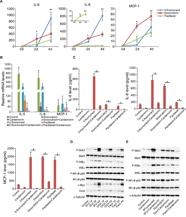 Inflammatory cytokines, NF-κB and Stat3 activation have been closely associated with cancer progression and CSC development [16, 17, 43–46]. We therefore determined whether chemotherapy drugs that led to CSC enrichment (Figure 1) would enhance the expression of inflammatory cytokines in breast cancer cells. Indeed, gene expression levels of IL-6, IL-8, and human monocyte chemoattractant protein-1 (MCP-1) were robustly elevated and also correlated positively with progressively increased CSC-marker genes in a time-dependent manner after treatment with doxorubicin, 5-fluorouracil, and paclitaxel (Figure 4A and 1C). Strikingly, cardamonin almost completely abrogated chemotherapeutic drug-upregulated transcription of IL-6, IL-8, and MCP-1 (Figure 4B), and also diminished protein expression of IL-6, IL-8, and MCP-1 (Figure 4C). These results indicate that cardamonin is capable of repressing key inflammatory cytokines closely associated with the development of CSCs.
