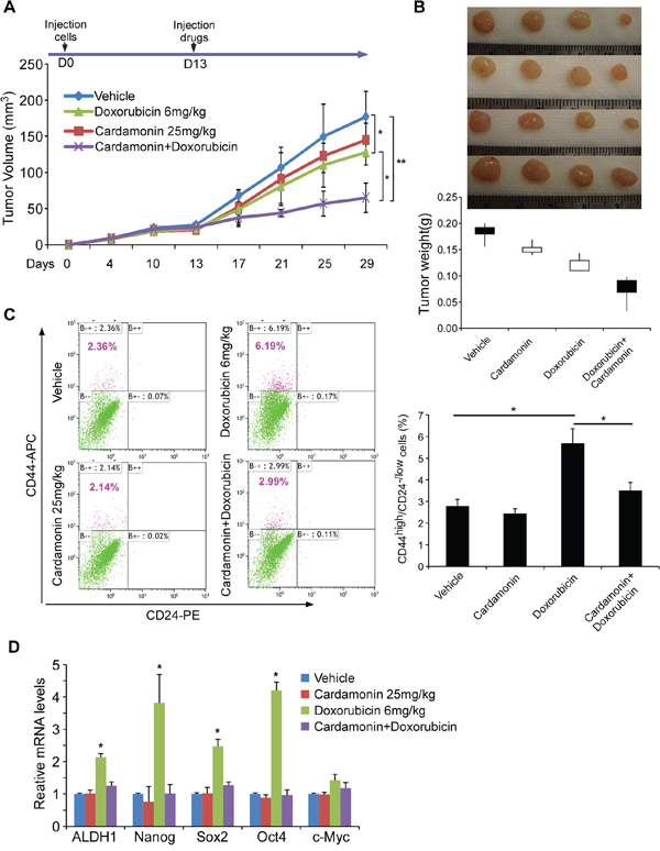 To determine whether cardamonin with doxorubicin reduces the CSC pool in vivo, we harvested tumors after three cycles of treatment and assessed the CD44high/CD24−/low subpopulation using flow cytometry. Notably, the CSC population in tumors harvested from mice receiving doxorubicin alone increased 2.5-fold over those receiving vehicle alone, although the tumor weights were lower and sizes smaller (Figure 5C). In contrast, co-administration of cardamonin and doxorubicin not only remarkably reduced the tumor growth but also abolished doxorubicin-enriched CSCs in mouse xenografts (Figure 5C).
