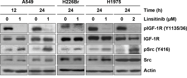 Figure 1: Induction of Src activation by linsitinib treatment. A549, H226Br, and H1975 cells were treated with 1 or 2 μM linsitinib (diluted in RPMI 1640 medium containing 10% FBS) for 12 or 24 h. Before harvest, cells were further stimulated with 10% FBS for 20 min. Cells were lysed with modified RIPA buffer and the protein expression was determined by Western blot analysis.
