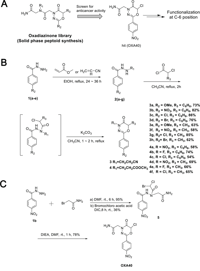 Figure 2: Synthesis of oxadiazinone derivatives. A. Hit compound (OXA40) was screened for anti-cancer activity from the peptoid library. B. Synthesis of 2-aryl-1,3,4-oxadiazin-5-ones containing functional groups at C6 position. C. Synthesis of OXA40 in solution phase.