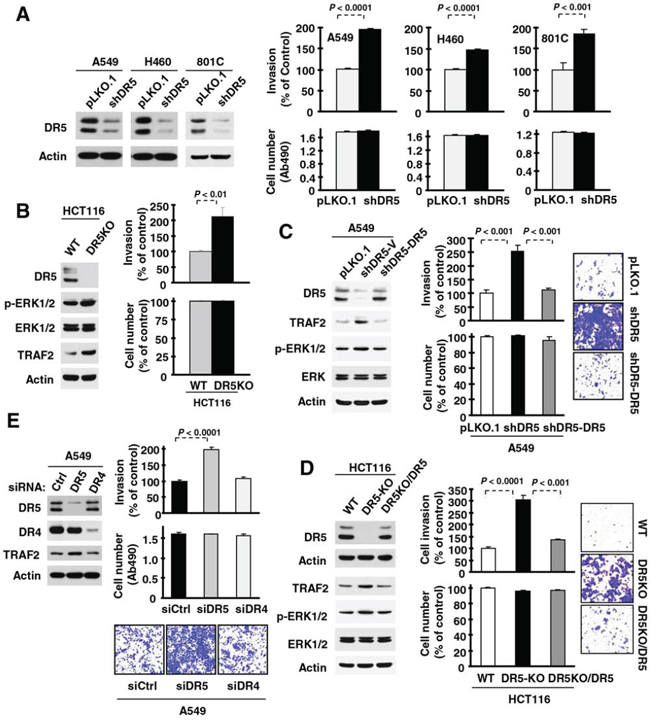 Figure 1: Suppression of DR5, but not DR4, expression increases cancer cell invasion. A–D. The indicated cell lines, in which DR5 was stably knocked down (A), knocked out (B), knocked down and then re-expressed (C) or knocked out and then re-expressed (D) as evaluated with Western blotting were plated in Matrigel invasion chambers for cell invasion assay and in 96-well plates for cell number estimation with MTS assay after approximately 48 h incubation. E. A549 cells transiently transfected with control (Ctrl), DR5 or DR4 siRNA were plated in 12-well plates for evaluation of DR5 or DR4 expression by Western blotting, in the Matrigel invasion chambers for invasion assay and in 96-well plates for cell number estimation after approximately 48 h incubation. The data are means ± SDs of triplicate (invasion) or quadruplicate (cell growth) determinations. WT, wild-type.