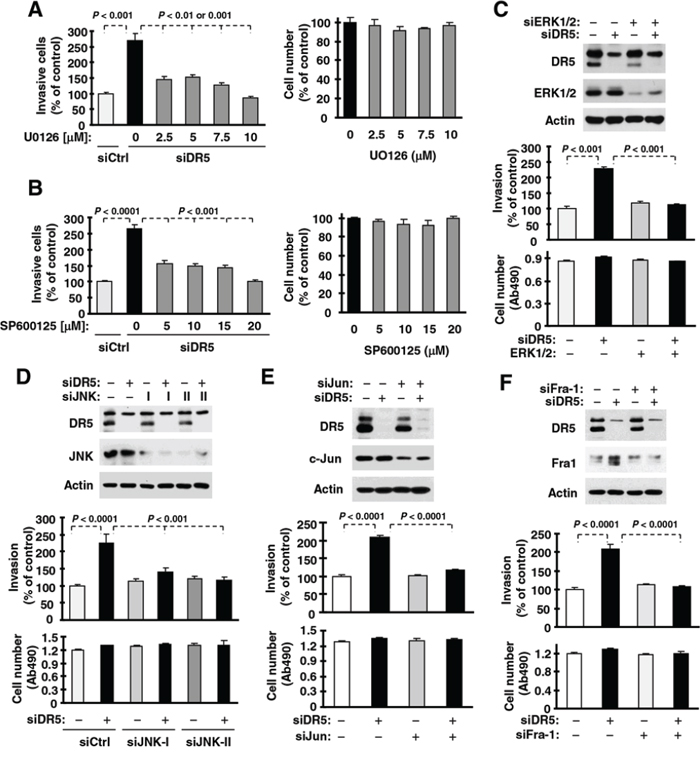 To determine whether the observed activation of ERK and JNK/AP-1 signaling is involved in the increased invasion induced by DR5 knockdown, we used both chemical and genetic approaches. In the presence of either the MEK inhibitor U0126 or the JNK inhibitor SP600125, the ability of DR5 knockdown to increase cell invasion was inhibited or abrogated (Figs. 4A and 4B). Under the tested conditions, these inhibitors minimally affected cell growth. In agreement, inhibition of ERK or JNK by gene silencing with the more specific siRNA approach also blocked DR5-induced promotion of cell invasion (Figs. 4C and 4D). Moreover knockdown of c-Jun or Fra-1, both of which are key components of the AP1 complex, inhibited promotion of cell invasion induced by DR5 knockdown (Figs. 4E and 4F). Therefore, it is clear that the activation of both ERK and JNK/AP1 is required for promotion of cell invasion induced by DR5 knockdown.